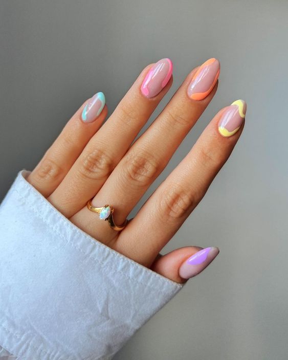 Warm nude nails are elevated with flowing pastel waves in peach, blue, and lavender. The look is modern, smooth, and effortlessly spring-ready.