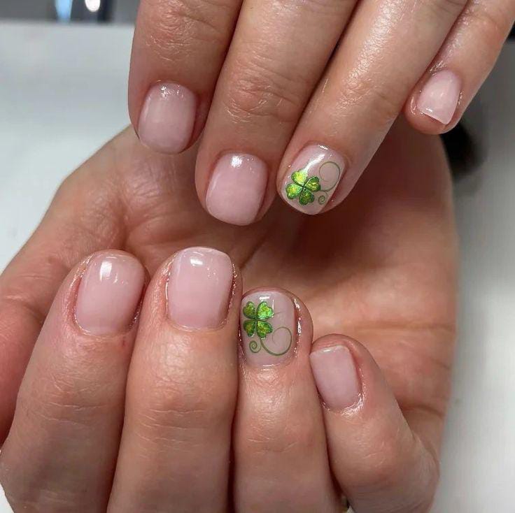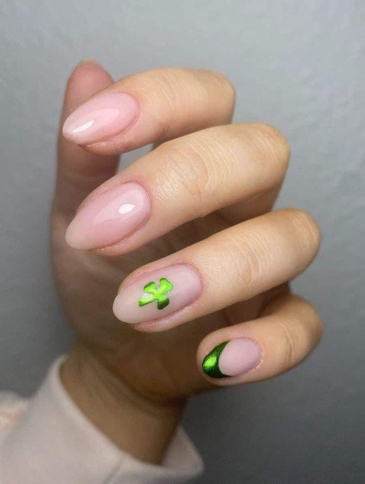 Light blush-pink nails are paired with a bright green shamrock on one finger and a simple green tip on another. The overall vibe is cute, minimal, and gently festive St. Patrick’s Day.