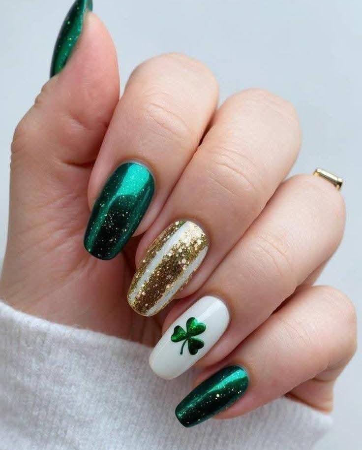 This design mixes deep emerald green with a touch of gold glitter for a classy St. Patrick’s Day vibe. The white accent nail with a small green clover adds a simple, lucky detail without feeling busy.