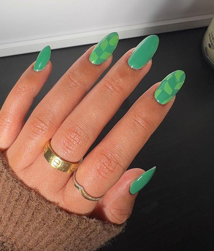 These nails feature different shades of green in a clean, glossy finish. The simple color-blocked style feels modern, fresh, and perfect St. Patrick’s Day look, if you want something minimal but festive.