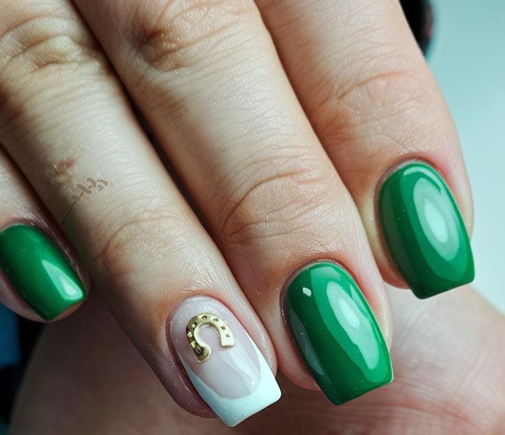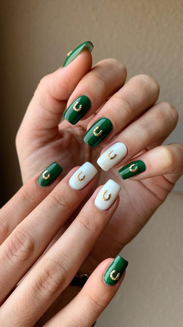 Rich green and soft white nails are mixed with small gold horseshoe charm details for a stylish holiday look. The overall vibe is elegant with just a hint of St. Patrick’s Day flair.