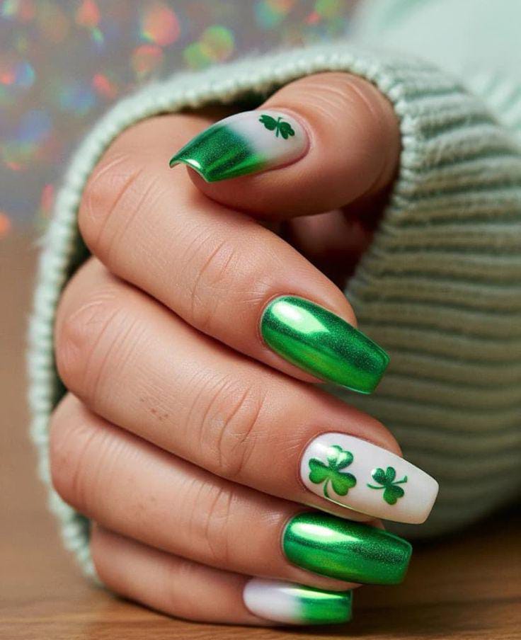 This design blends shiny chrome green with soft white ombré tip accents. The small shamrock details give it a festive St. Patrick’s Day touch while still looking elegant and polished.