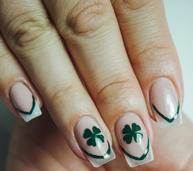 These nails feature a soft nude tip base with tiny green shamrocks for a clean, simple St. Patrick’s Day look. The style feels fresh, minimal, and easy to wear everyday.