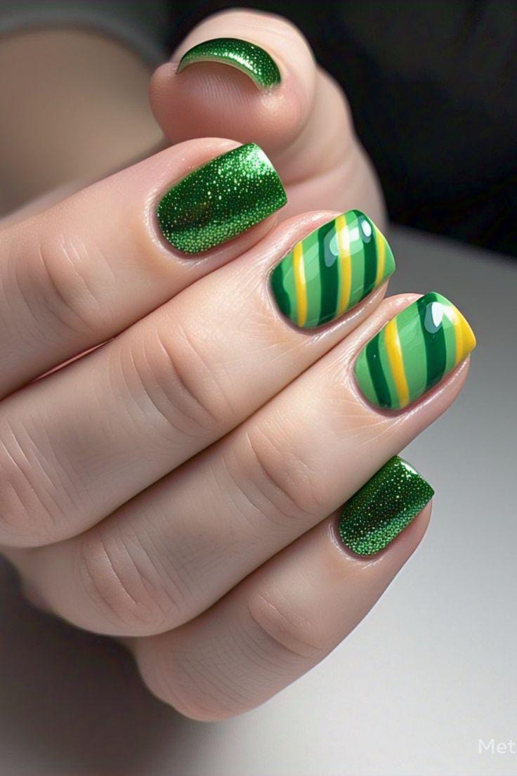 This design mixes rich green tones with soft shimmer-like chrome and yellow striped accent nails for a festive St. Patrick’s Day pop. It feels fun and eye-catching while still staying neat and wearable.