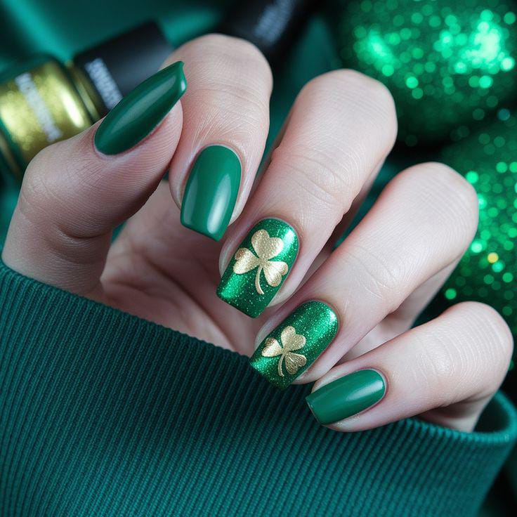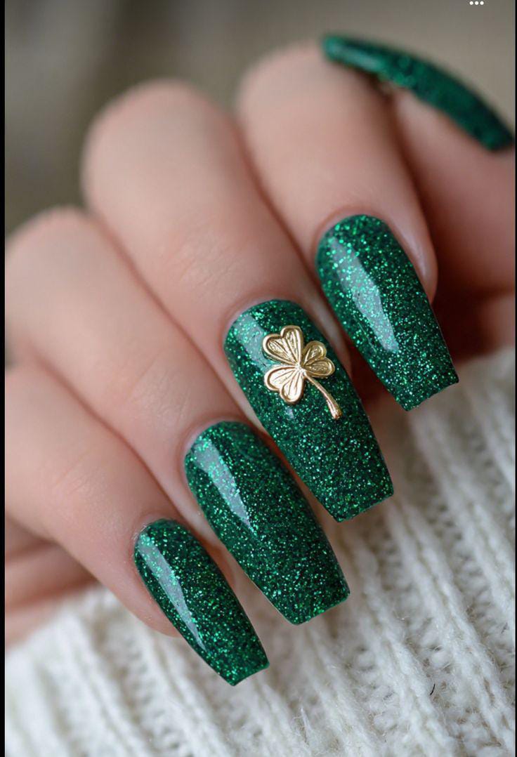 Deep green nails paired with glittery accents and gold shamrock details create a classy holiday look. The overall vibe is festive but polished, perfect for a dressier St. Patrick’s Day style.