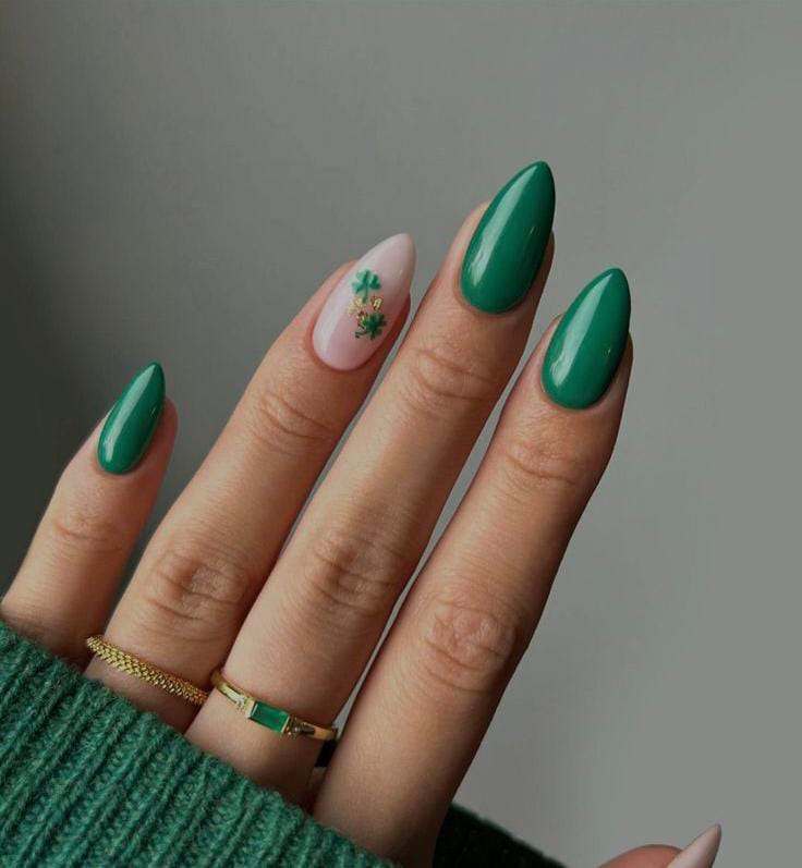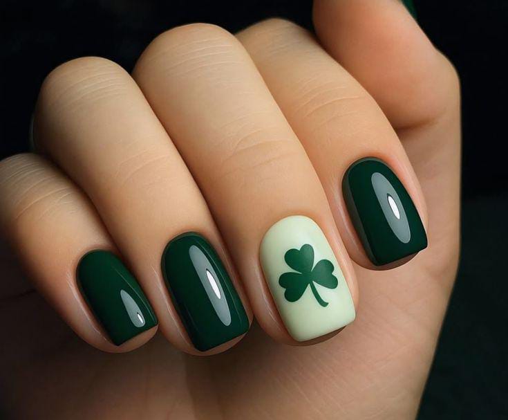 Deep green glossy nails are paired with a single pale accent nail featuring a bold shamrock. The design feels modern and festive St. Patrick’s Day without being too busy.