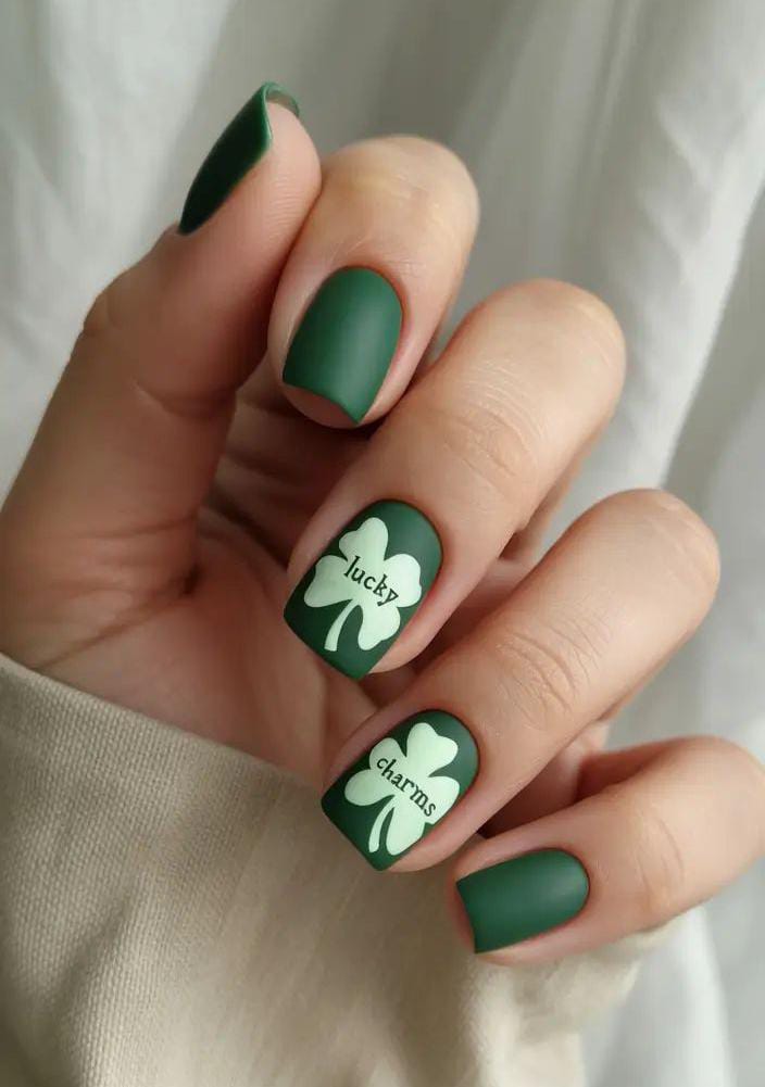 Soft matte green nails with cute shamrock lettering bring a cozy, playful vibe. The design feels simple and fun, with a clear St. Patrick’s Day theme without being too bold.