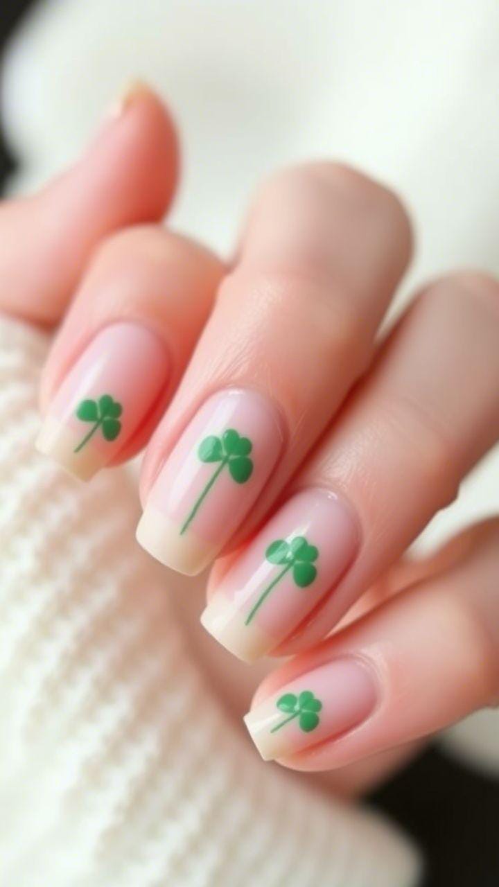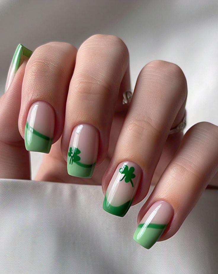 Sheer nude nails are finished with soft green French tips and small shamrock details. The style is light, playful, and very wearable for everyday St. Patrick’s Day looks.