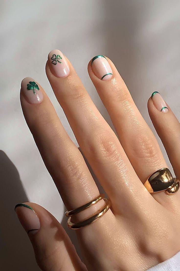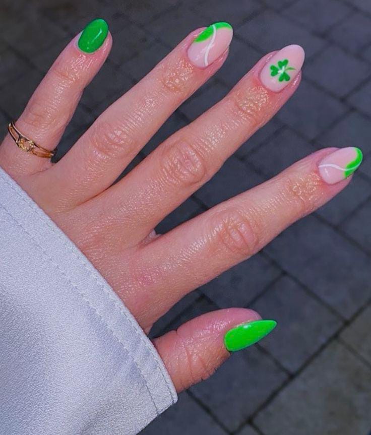 Bright green and soft nude bases create a fun, trendy look with a shamrock accent. This design feels youthful, fresh, and perfect for a casual St. Patrick’s Day vibe.
