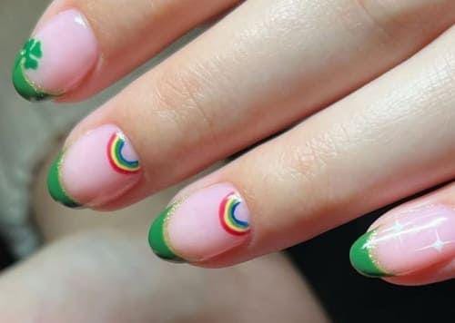 Soft pink nails with green French tips get a playful St. Patrick’s Day touch from tiny rainbow accents. The look feels light, cute, and festive without being too bold.
