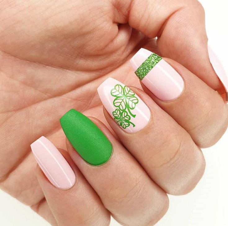 This design mixes soft blush pink with rich green tip accents for a classy St. Patrick’s Day look. The leafy vine artwork and subtle glitter stripe give it a fresh, elegant vibe without feeling too bold.