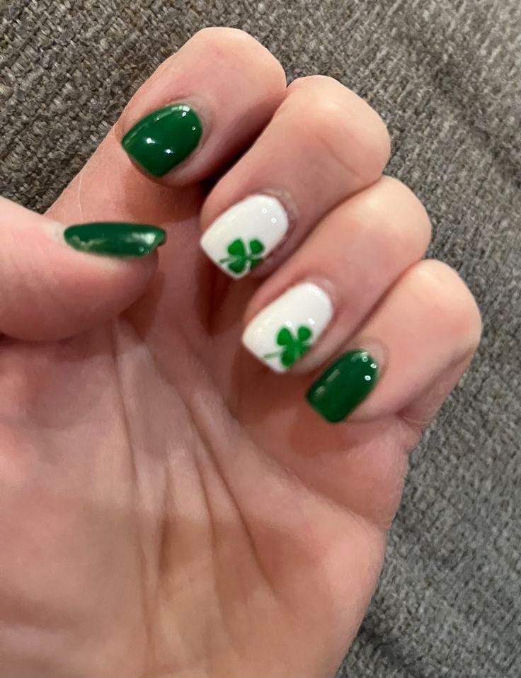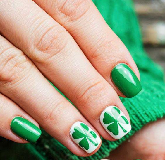 This design combines solid green nails with white accent nails decorated with bold clovers. It has a cozy, traditional St. Patrick’s Day feel that’s simple, cheerful, and easy to wear.