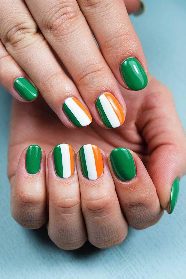 Inspired by the Irish flag, this design features green, white, and orange vertical stripes alongside glossy green nails. The look is bright, patriotic, and clean, perfect for a subtle St. Patrick’s holiday statement.