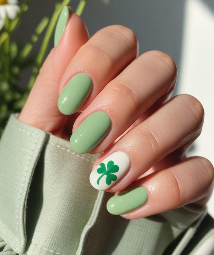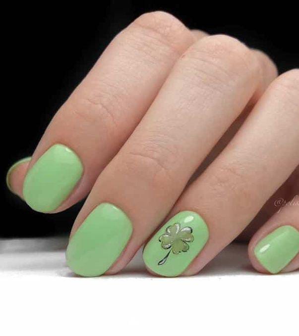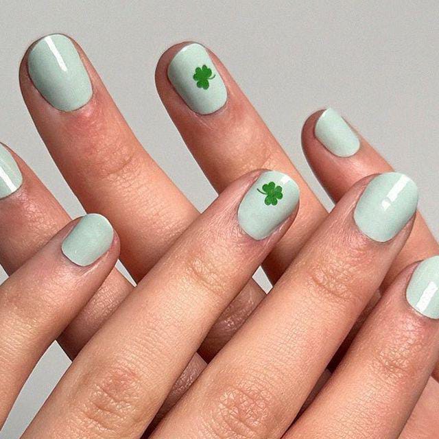 These short, rounded nails are painted in a smooth pastel mint shade with a single clover accent on one nail. The overall vibe is minimal, cute, and perfect St. Patrick’s day looks for someone who prefers subtle festive details.
