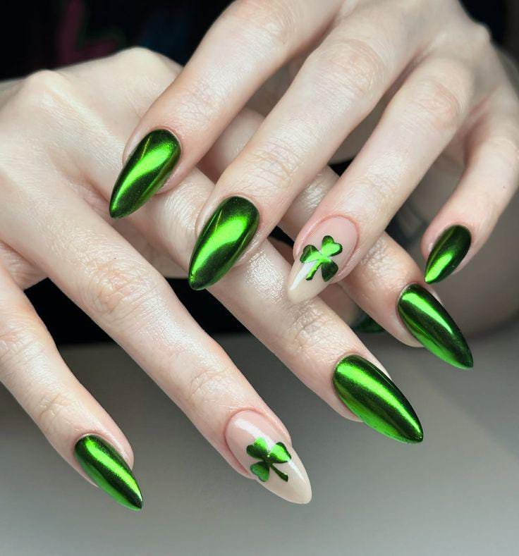 This bold design combines glossy emerald chrome nails with nude accent nails decorated with small chrome green clovers. The shiny metallic finish adds a glamorous twist while still staying on-theme for St. Patrick’s Day.