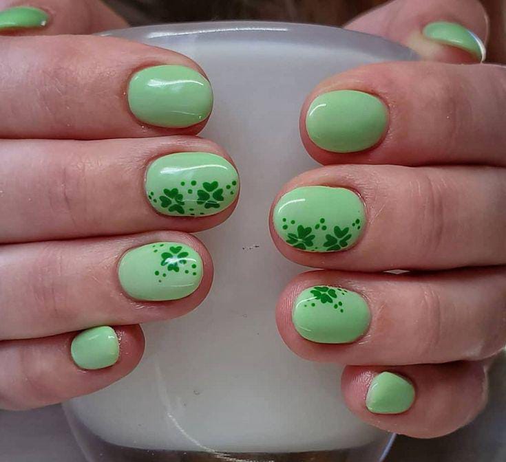 These short nails use a light mint green base with small floral dot-style clover patterns and dotted details. The design feels fresh, cheerful, and very wearable for everyday St. Patrick’s Day looks.