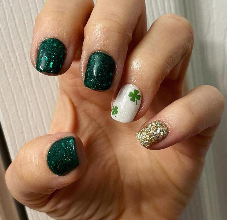 This design mixes deep emerald green shimmer nails with a clean white accent featuring tiny clovers. A touch of gold glitter adds a festive glow, giving it a classy St. Patrick’s Day vibe without feeling overdone.