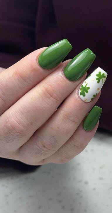 Rich green nails are paired with a single white accent nail decorated with small clovers and glitter dots. The look is simple, glossy, and cheerful—perfect for a traditional St. Patrick’s Day style.