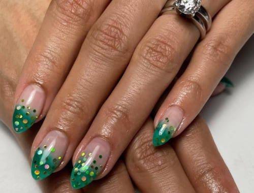 Natural nude nails fade into green tips with scattered chunky glitter-like dot accents that feel like lucky confetti. The design looks fun and celebratory St. Patrick’s Day while still staying simple and neat.