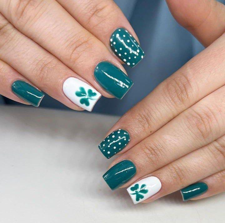This playful design combines rich green nails with white polka dots and white accent nails featuring clovers. It has a fun, lighthearted St. Patrick’s Day feel that still stays neat and simple for everyday wear.