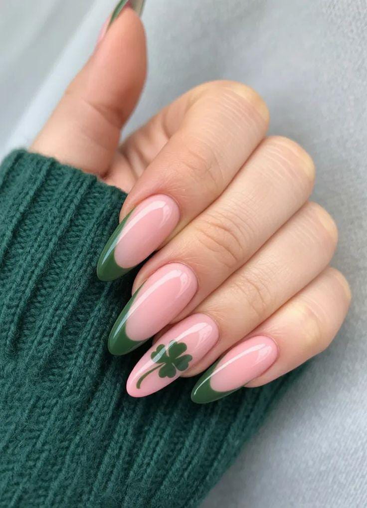 A soft pink base is combined with green French tips and a small clover detail on one nail. The vibe is cute, gentle, and perfect for an everyday St. Patrick’s Day look.