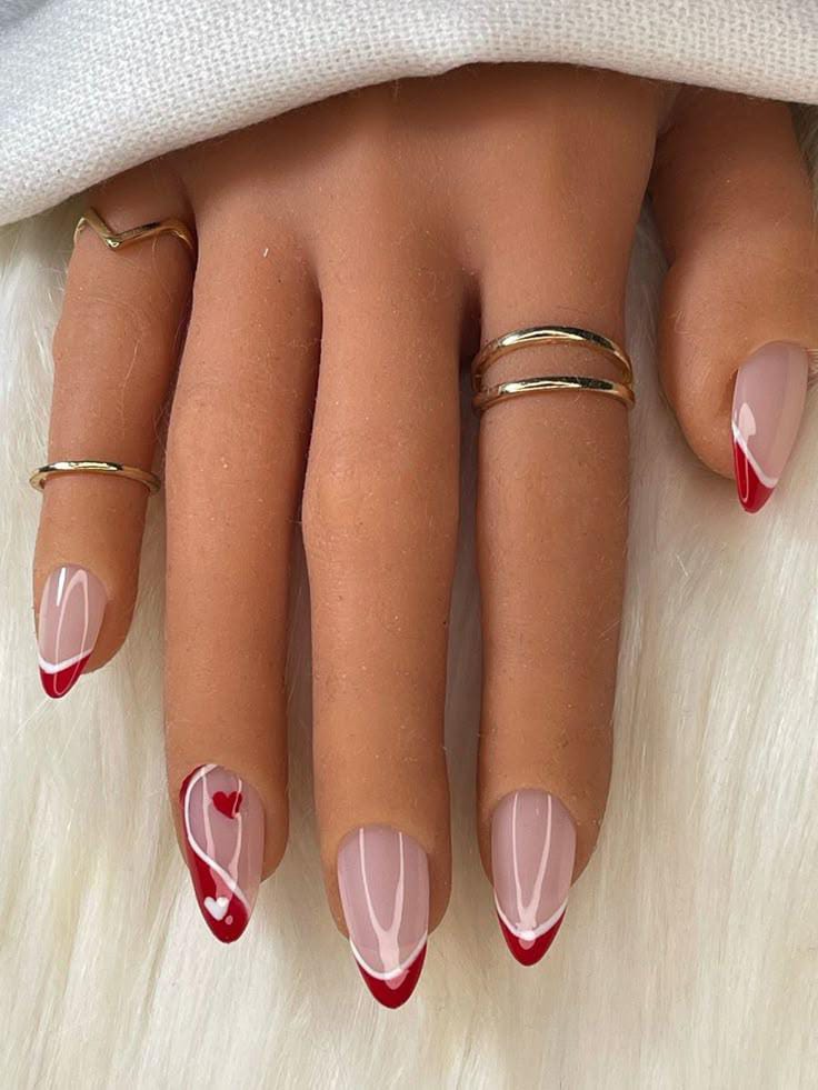 Soft nude nails with bold red tips and delicate white swirls create a romantic, flowing look, accented by tiny hearts for a simple Valentine’s vibe.