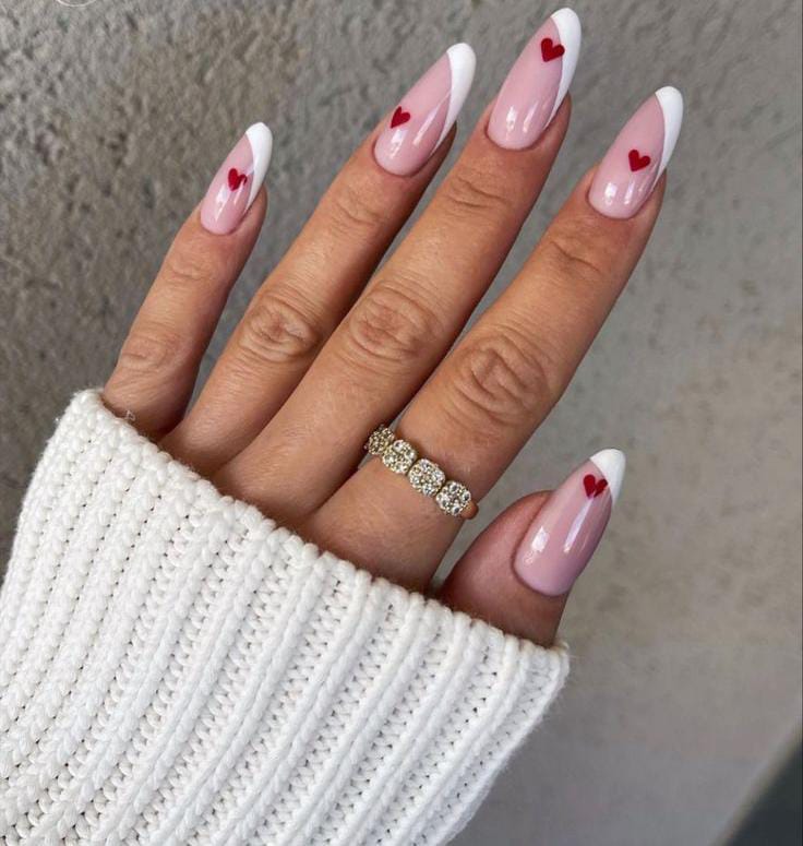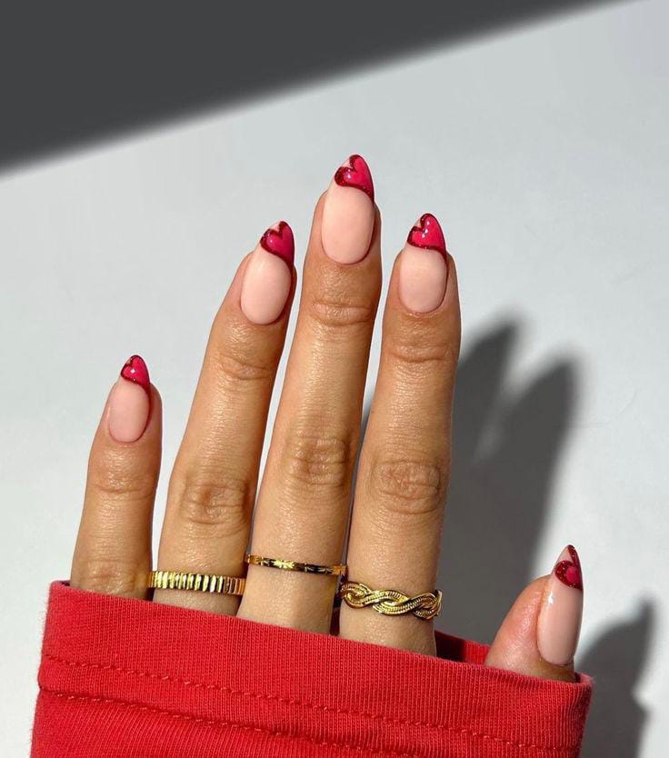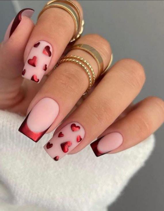 These nails feature a matte blush base filled with shiny red heart accents and deep red French tips, creating a simple but elegant Valentine vibe.