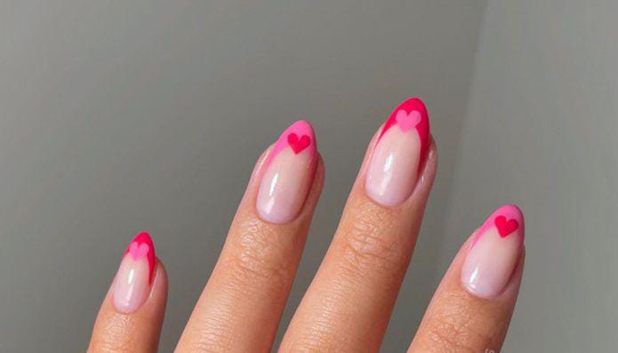 This design features natural pink nails with bright hot-pink French tips, each topped with a small heart for a playful, simple and flirty Valentine vibe.