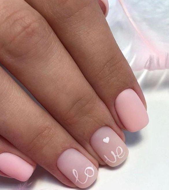 A soft matte light pink base is paired with delicate white lettering LOVE and a tiny heart, creating a sweet and minimal romantic Valentine look.