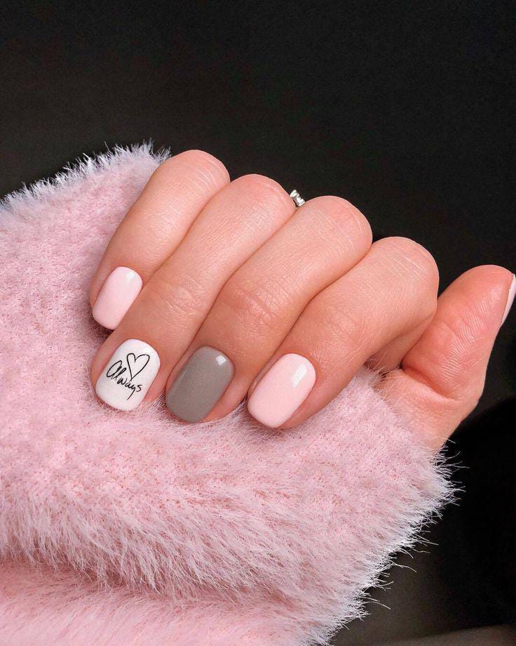 Light pink and neutral grey nails are paired with a crisp white accent nail featuring a heart and the word “Always,” giving the manicure a cozy yet simple Valentine feel.