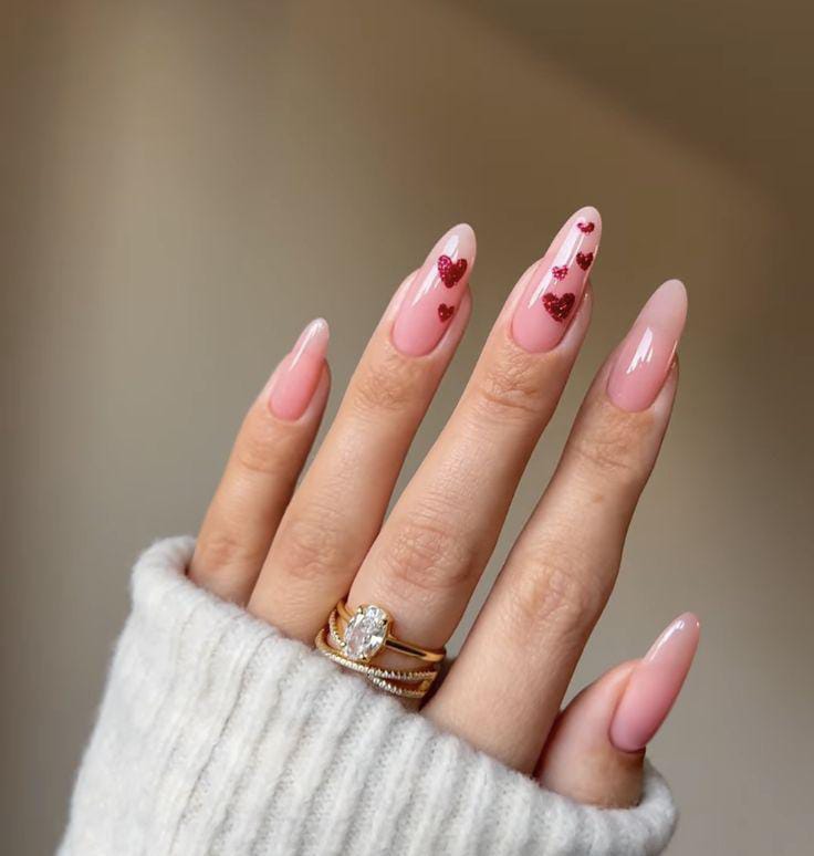 Glossy almond-shaped pink nails are accented with tiny red glitter hearts cascading down a couple of fingers, adding a simple sparkle and romantic Valentine charm.
