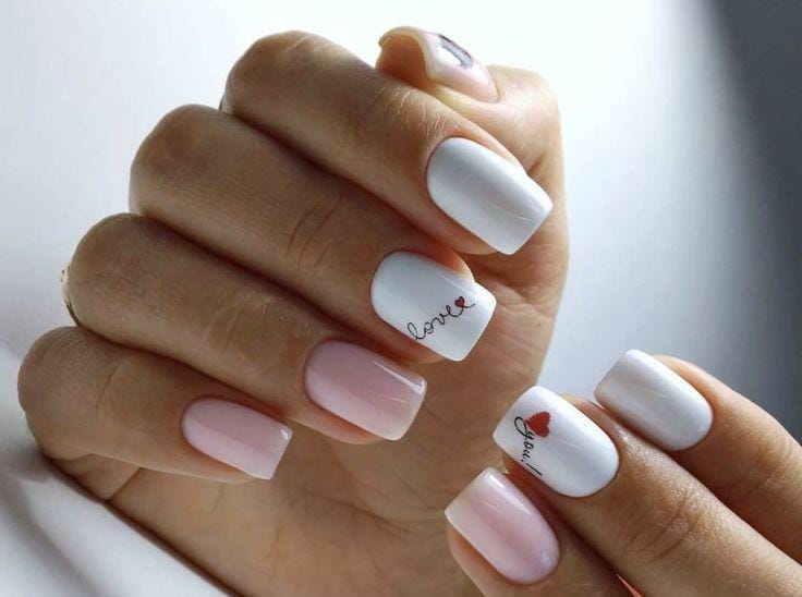 A blend of soft pink and white nails with simple heart accents and the word “love” written in thin script creates a clean, simple Valentine design that feels fresh.