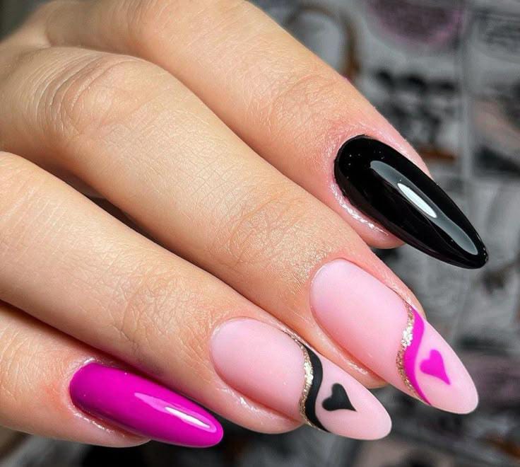 This design mixes hot pink, glossy black, and soft nude tones with tiny heart accents and metallic waves for a bold yet romantic Valentine’s look. The combination feels simple, edgy, and playful.