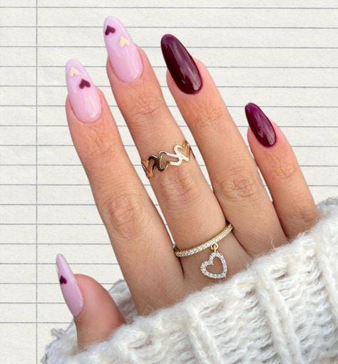 Soft pink nails paired with deep berry red accents create a sweet, cozy vibe, while tiny heart motifs add a simple Valentine’s charm.