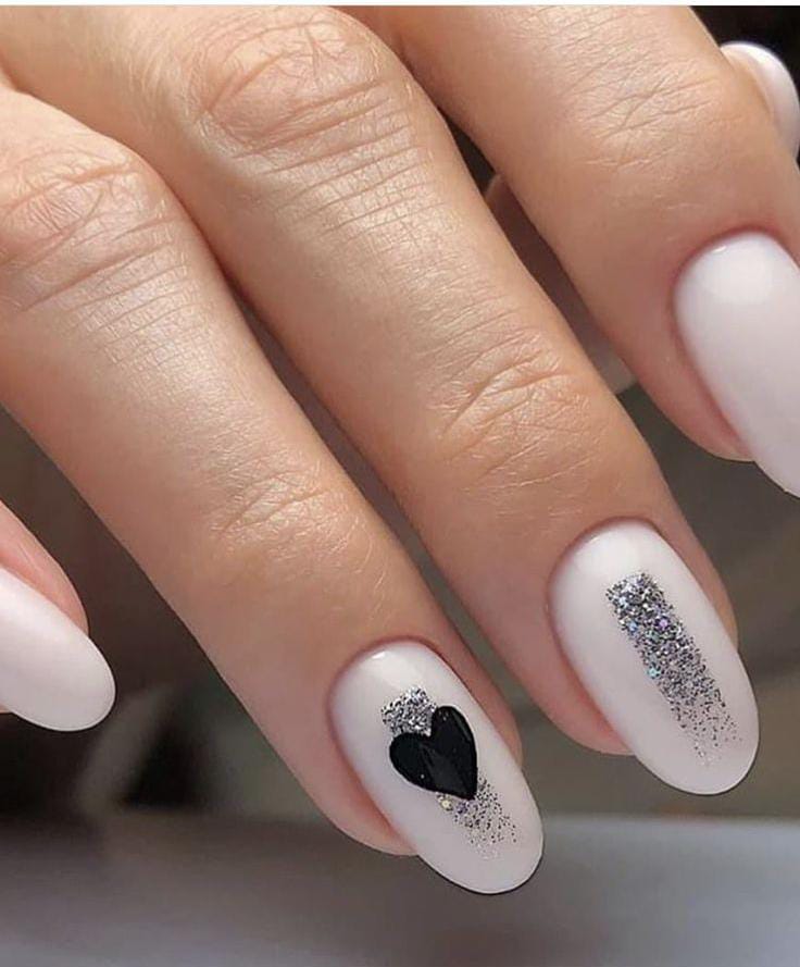 A minimalist white base is accented with a single black heart and silver glitter, giving the nails a clean but glamorous feel. It’s understated yet eye-catching, perfect for a classy Valentine’s style.