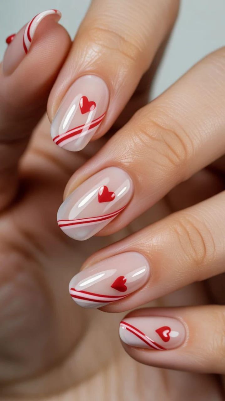 Clear-pink nails are decorated with red hearts and smooth red striping, giving a fun candy-inspired Valentine’s aesthetic. The look feels fresh, simple, and full of cute energy.