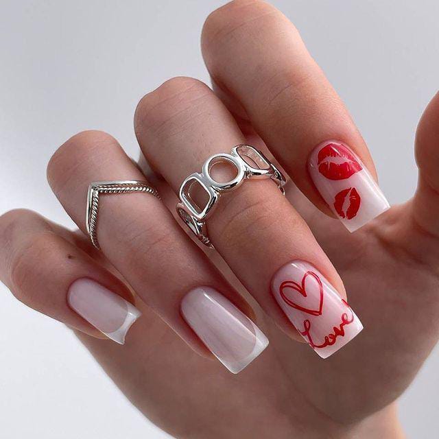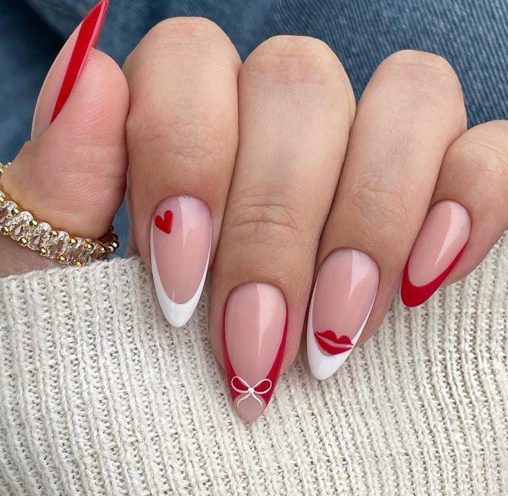 A mix of red and white French tips paired with tiny hearts, lips, and a small bow gives this set a cute, simple Valentine’s charm without looking overdone.