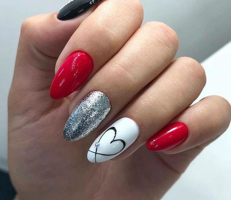 Bright red nails paired with a silver glitter accent and a simple black heart outline on white create a bold, festive Valentine’s combo. The mix of colors makes the design lively while still simple and romantic.