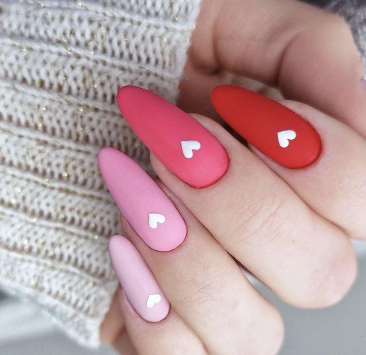 This design features smooth matte nails in soft pinks and bold reds, each one topped with a tiny white heart that adds a sweet and simple Valentine’s charm.
