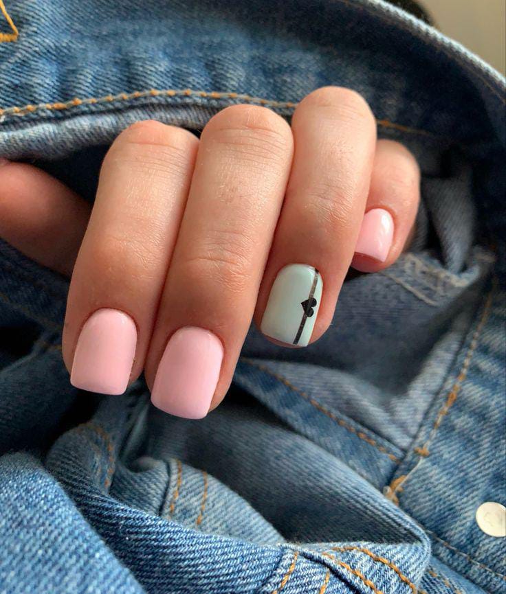 Soft baby-pink nails are paired with a single mint-green accent nail, decorated with a thin black line and a tiny heart for a cute minimalist Valentine’s touch.