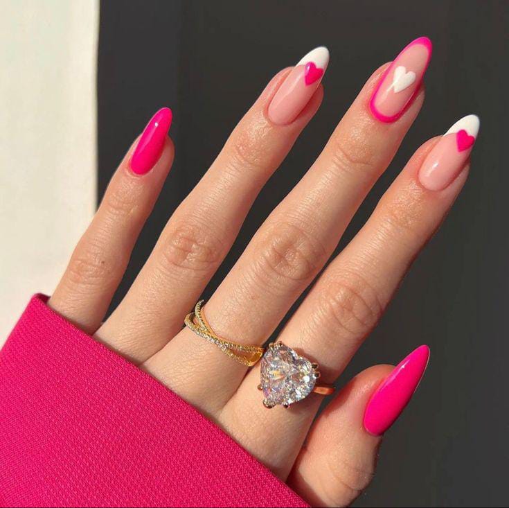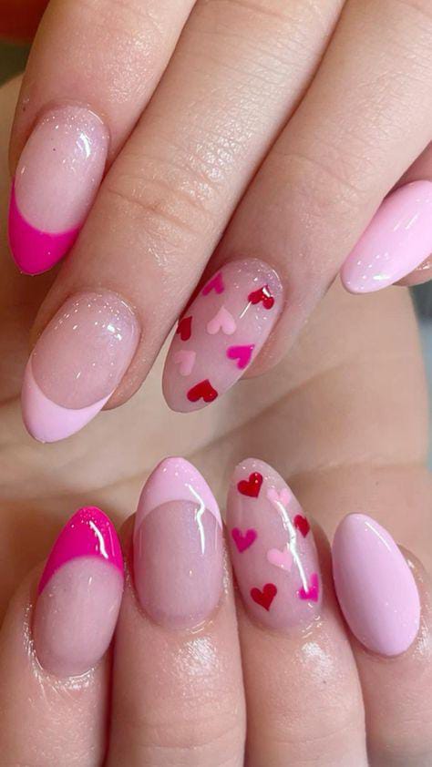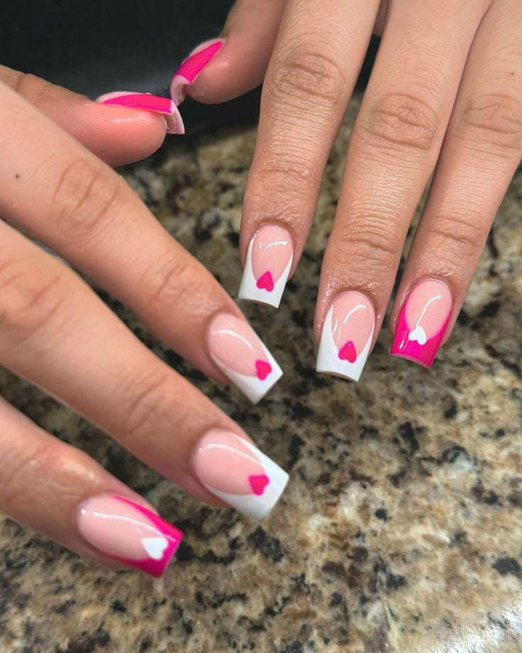 A lively mix of hot-pink nails and soft nude nails with white french tips and small heart designs, giving a playful and simple Valentine’s feel.