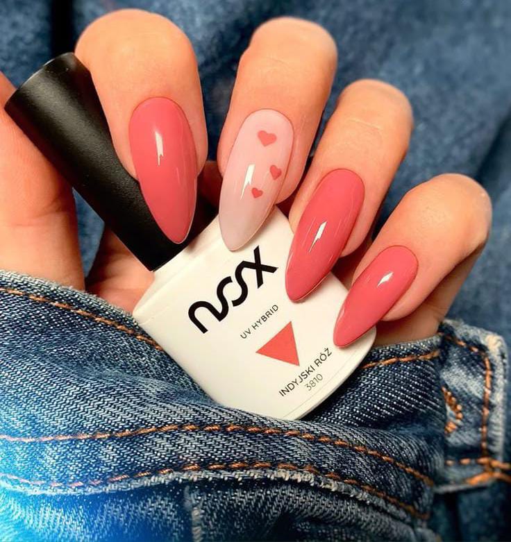 Long rosy-pink nails are complemented by a soft nude accent nail decorated with tiny hearts, striking a balance between simple and sweet. The warm romantic tones make the whole look feel polished and perfect for Valentine’s Day.