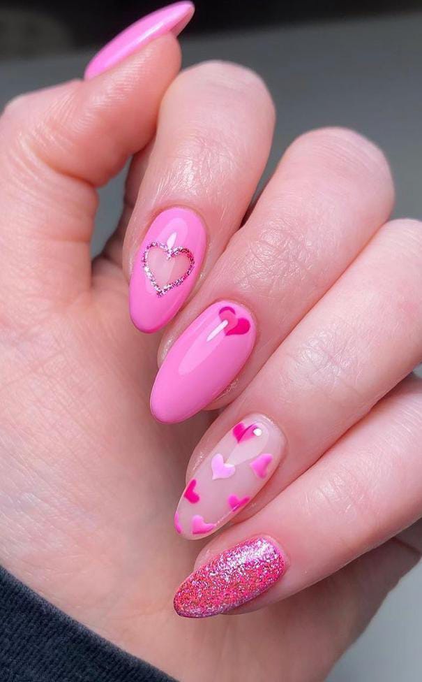 A bright, playful pink manicure featuring glossy shades, glitter accents, and scattered heart designs that give it a simple, cute, and romantic Valentine vibe.
