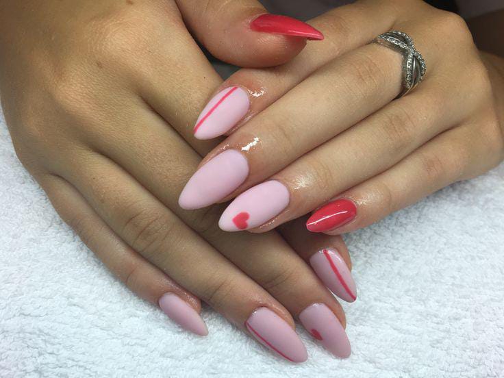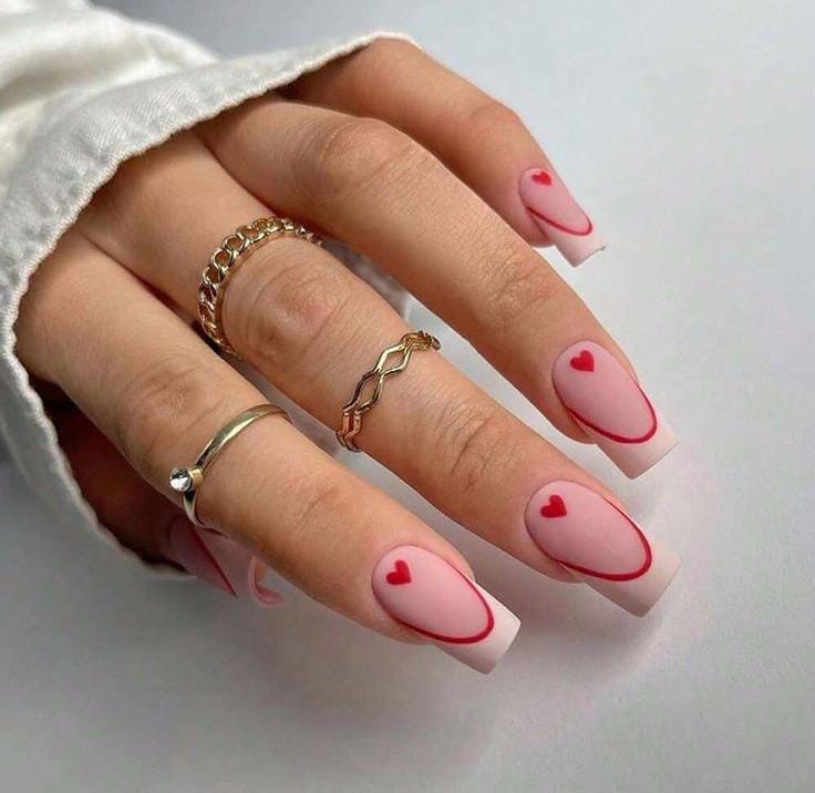 Soft blush-pink nails with subtle red line art and tiny heart accents, mixed with a few bold red nails for a clean, modern and simple Valentine’s style.