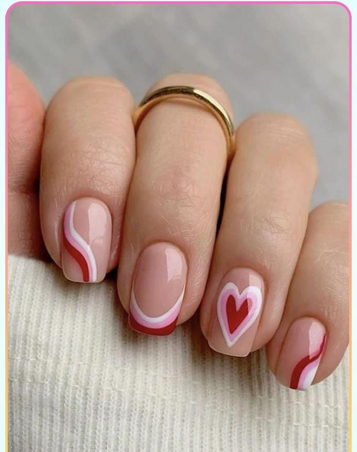 Short nude nails with red and white swirled tips and a bold heart accent, blending simplicity with a fun, retro-inspired Valentine’s style.