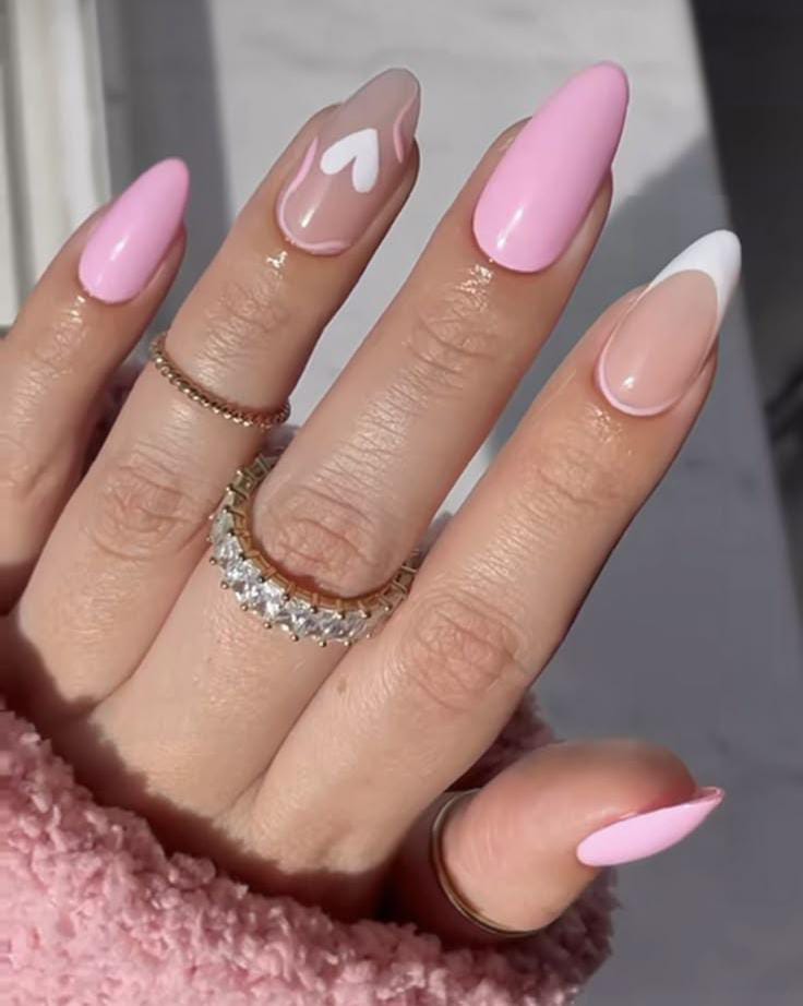 A mix of pink tones, from solid glossy nails to soft white details and a heart accent, giving the manicure a simple and feminine Valentine’s feel.