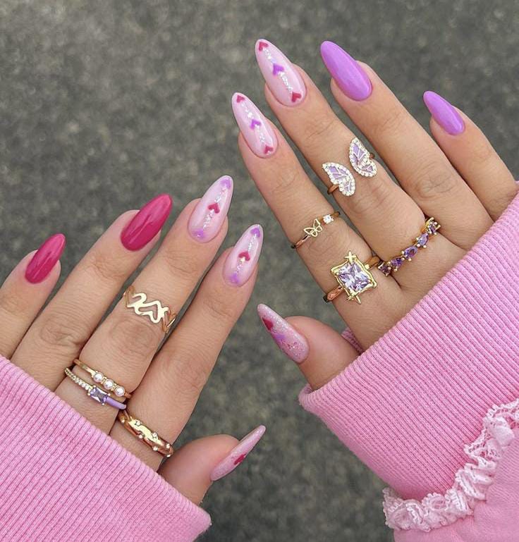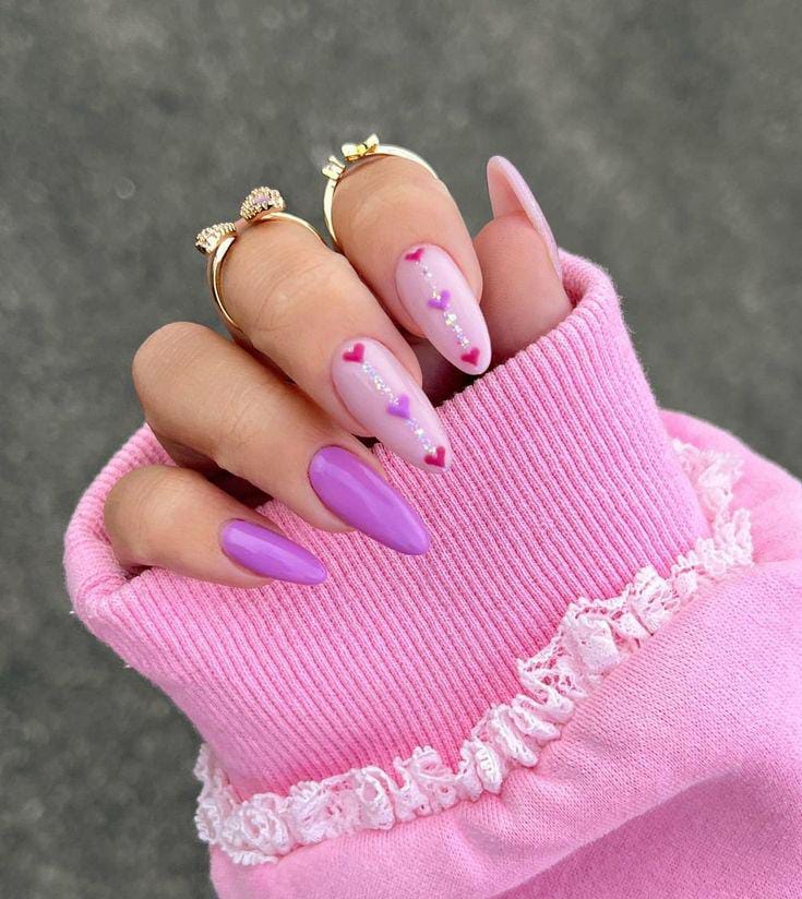 A mix of solid lavender nails and sheer pink nails decorated with small purple hearts and glitter makes this design soft, girly, and effortlessly Valentine look.