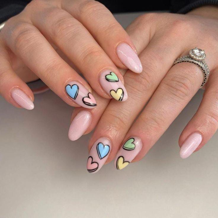 Bright pastel hearts outlined in black pop against a soft pink base, giving the nails a fun, cartoon-style Valentine’s feel that’s colorful and simple.