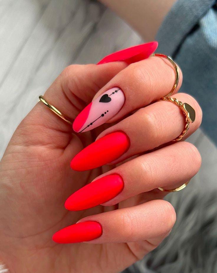 A bright, matte hot-red set with one soft-pink accent nail featuring a small black heart and delicate dotted lines for a striking but simple Valentine’s vibe.