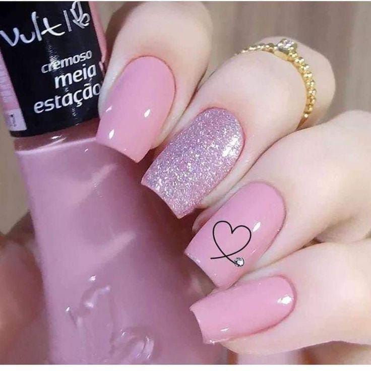 A sweet pastel-pink manicure paired with one glittery nail and a simple black heart outline, creating a simple, romantic Valentine’s look with a touch of shine.